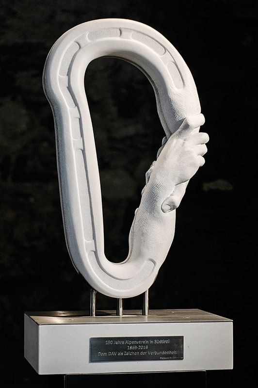 Laas/München - Vom in Laas geborenen Bildhauer und Steinmetz Elias Wallnöfer stammt ein aus Laaser Marmor gefertigter Karabinerhaken im XXL-Format. Wallnöfer schuf das Werk als Geschenk des Alpenverein Südtirol (AVS) für das 150-jährige Bestandsjubiläum des Deutschen Alpenvereins (DAV). Das Meisterwerk wird vom AVS am 25. Oktober 2019 in München anlässlich des Jubiläumsfestes des DAV als Zeichen der Verbundenheit im Alpenverein übergeben. Es gibt wohl kaum ein besseres Symbol, als einen Karabin…