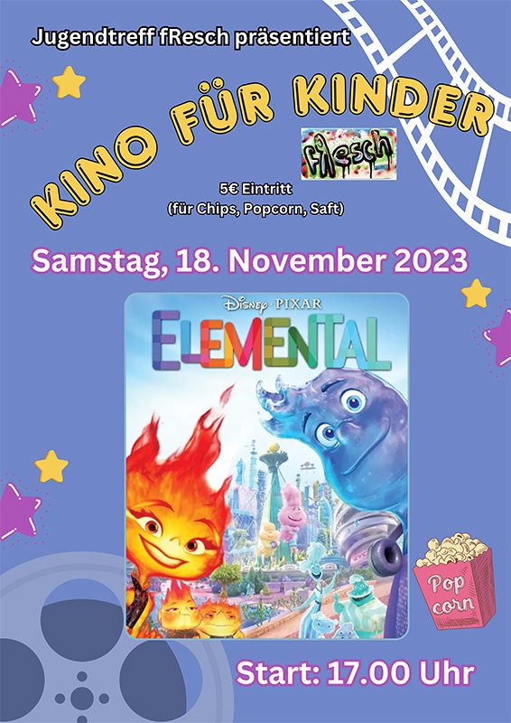 Am Samstag, 18. November 2023 sind alle Kinder herzlich eingeladen, ab 16.45 Uhr im Jugendtreff fResch in Reschen mit dem angebotenen Popcorn, Chips und Saft beim Kinderkino dabei zu sein. Das fResch Team freut sich auf Euer Kommen!