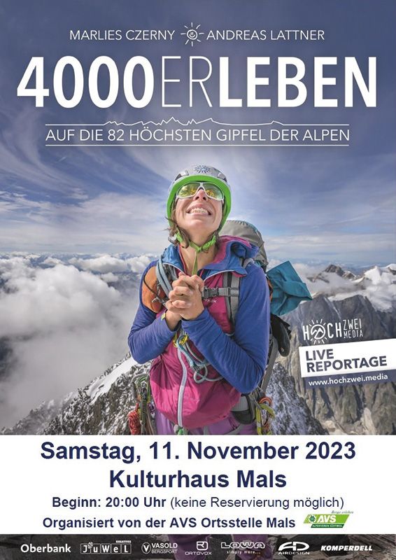 ASV Mals - Am 11. November sind Marlies Czerny und Andreas Lattner zu Gast im Kulturhaus von Mals und werden einen Vortrag unter dem Titel „4000Erleben - Auf die 82 höchsten Gipfel der Alpen“ halten. Vor vier Jahren erschien Czernys Buch „4000Erleben - Von Null auf die höchsten Gipfel der Alpen“, die Bilder im Buch stammen von Lattner. Nun werden sie im Vinschgau über ihre Erfahrungen und Abenteuer in den Bergen berichten. Die Veranstaltung beginnt um 20 Uhr, organisiert wird der Vortrag v…