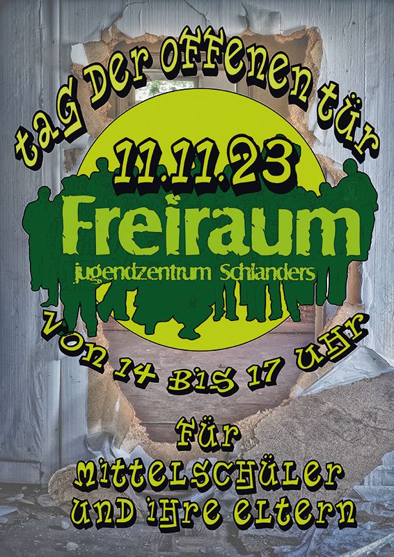 Am 11.11.23 lädt das Jugendzentrum Freiraum, von 14 bis 17 Uhr, alle interessierten Mittelschüler und ihre Eltern ein, damit sie das Jugendzentrum entdecken und kennenlernen können.