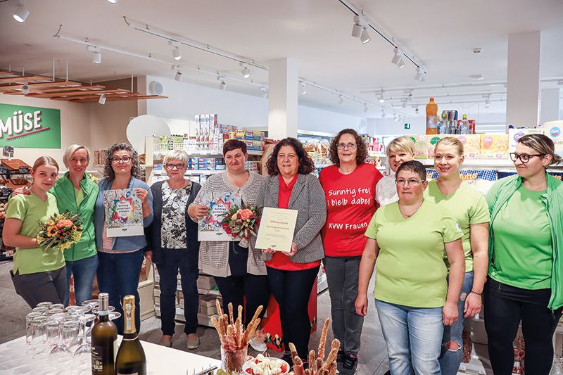 Laas/Vinschgau - Das Team der Konsumgenossenschaft Laas freute sich kürzlich über die Auszeichnung der KVW-Frauen im Bezirk Vinschgau. „Mit dieser Auszeichnung würdigen wir Betriebe, die viele Frauen beschäftigen und ihnen auch die Möglichkeit geben, in Teilzeit zu arbeiten. Der Konsum in Laas ist ein Vorzeigebetrieb in diesem Bereich“, erklärte die KVW Bezirksvorsitzende Gertrud Telser Schwabl. „Und wir würdigen vor allem auch die Entscheidung der Geschäftsleitung, die Sonntagsruhe einzuhalten…