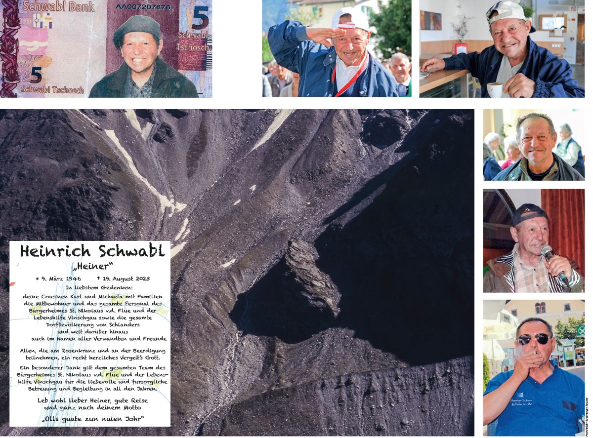 Durch die Botschaften seines Lachens erschuf er sich sein persönliches Wappen. Die Sterzinger zeigen in ihrem Stadtwappen den „Störzling“, einen betenden Pilger mit Rosenkranz. Ein Pilger war der Heiner auch, ein Bettler sein ganzes Leben lang Gebettelt hat er nur um den lebensnotwendigen „Tschosch“. Sein Verschwinden hat allgemein Überraschung und Trauer ausgelöst. Aber was bedeutet Heiners durch ein mangelhaftes Gebiss verursachter Erstickungstod? Was der Heiner ist, erkennen wir am besten du…