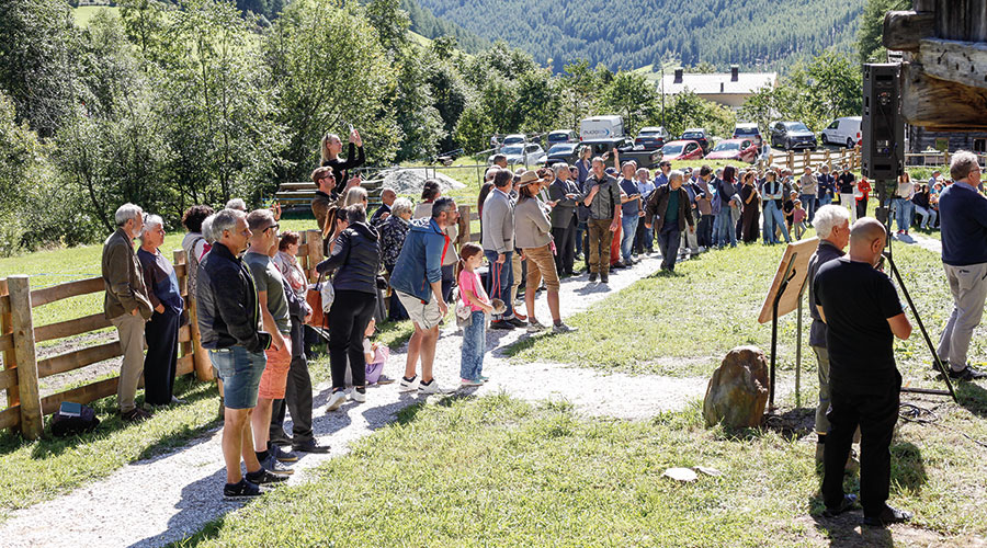 Der Rahmen für die Eröffnung der Slow-Food-Spezialitätenwoche in Schnals konnte heuer nicht stimmiger sein. Als der Schnalser HGV-Obmann Benjamin Raffeiner am Samstag, den 6. September, die Gäste zu pulled lamb zu Kräuterpolenta an Peperonata bat und damit die 10. Spezialitätenwochen rund um Lammgerichte in Schnalser Gastronomiebetrieben eröffnete, waren gerade im neu errichteten „Campus Transhumanza“ in Unser Frau gleich drei Premieren über die Bühne gegangen. Im Rahmen des PNRR-Projektes „Senales Borgo in movimento” wurden Stadel in Unser Frau renoviert und mit reichlich Software ausgestattet. Unter der Moderation von Karin Tscholl und mit Ankündigung vom Schnalser Kultur-Assessor Otto Rainer wurde vor großem und interessiertem Publikum die Dauerausstellung zur Transhumanz, eine wuchtige Steinskulptur und die musikalische Premiere der Komposition „Motus“ eröffnet und vorgestellt.