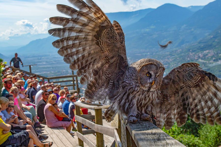 Das weithin geschätzte Ausflugsziel oberhalb von Meran lädt Besucher täglich zu beeindruckenden Flugshows um 11.15 Uhr und 15.15 Uhr ein und bietet dabei faszinierende Einblicke in die Welt der Greifvögel.