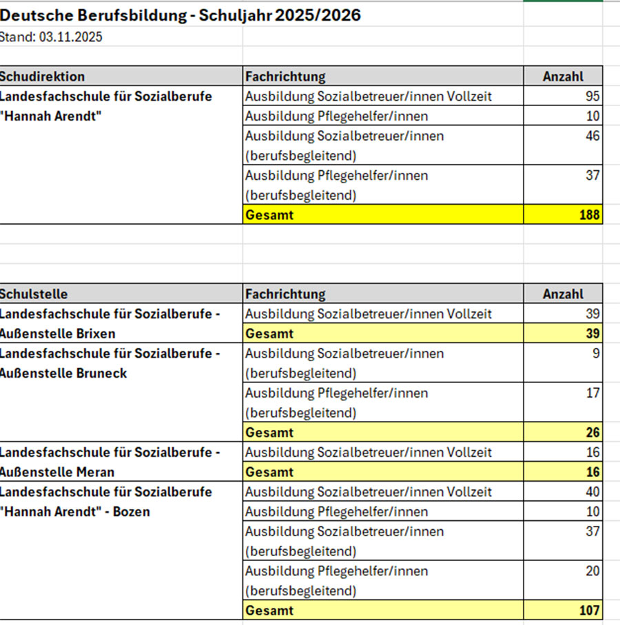 Laut Schätzungen der Landesabteilung Soziales und der Bezirksgemeinschaften werden in den kommenden Jahren mehr als 600 zusätzliche Pflege- und Betreuungskräfte benötigt. Schon heute melden viele Seniorenheime und Sozialdienste massive Schwierigkeiten bei der Einstellung von Personal. Zwar bestehen auf Landesebene auch berufsbegleitende Ausbildungsmöglichkeiten, doch diese alleine werden den dringend benötigten Nachwuchs nicht sichern können. Gerade die geringe Zahl der Schüler:innen zeigt, dass es zunehmend schwieriger wird, junge Menschen für eine Laufbahn in der Pflege zu gewinnen.