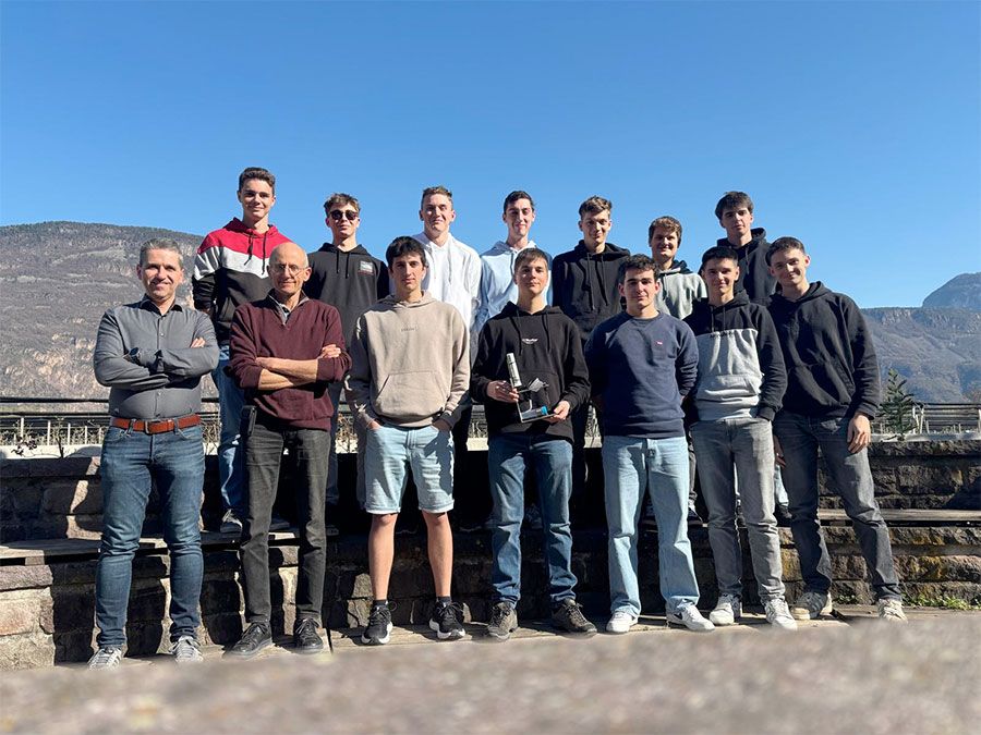 Gruppenbild mit Forstsensor: Schüler der Fachschule Laimburg haben einen eigenen Frostsensor gebaut und über The Things Network TTN vernetzt; vorne Zweiter von links Martin Thalheimer vom Versuchszentrum Laimburg, ganz links Lehrer Florian Scherer. (Foto: LPA/Fachschule Laimburg)