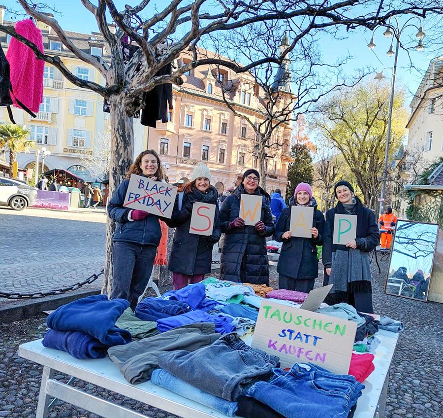 Als bewusstes Gegenmodell zum sogenannten Black Friday, findet auf dem Bozner Pfarrplatz sowie mobil in der Innenstadt die Kleidertauschparty der Grünen. Zahlreiche Menschen nutzen die Gelegenheit, gut erhaltene Kleidung kostenlos zu tauschen und damit eine praktische, günstige und nachhaltige Alternative zum Neukauf zu wählen.
