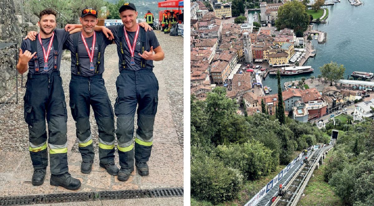 oben v.l. Elias Gruber, Lukas Pöhli und Daniel Peer von der FF Prad. links: Musste mit vollem Atemschutz erklommen werden: der Gardalift in Riva del Garda