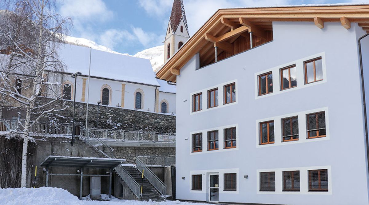 Der Zugang zur neuen Grundschule erfolgt über das 1. Obergeschoss. Das große Vordach beim Eingang von Kindergarten und Grundschule Martell bietet hier Schutz bei schlechtem Wetter. Energetisch hat das Kindergarten- und Grundschulgebäude mit der Sanierung natürlich einen Quantensprung gemacht. Alle Fenster, das Dach und sämtliche Heizungs-, Sanitär- und Elektroleitungen wurden ausgetauscht, Radonschutzmaßnahmen gesetzt und die Brandschutzbestimmungen angepasst.