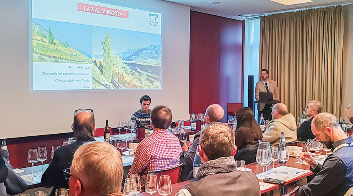 Das Räthische Weingebiet (Vinschgau, Graubünden, Liechtenstein, Tirol) ist speziell geeignet für die Kultivierung der edelsten Rotweinsorte, dem Pinot Noir/Blauburgunder. Am wohl prestigereichsten Weinevent Italiens, dem Merano Winefestival, gab es eine eigene Masterclass für diese Blauburgunder. In genau einer Stunde konnten die Teilnehmer am ausverkauften Weinseminar die ganzen Facetten dieser feinen Weine erleben. Besonders erfreulich war die Präsenz einiger Topwinzer aus Kampanien, welche sich ein Bild machen wollten, wie alpine Blauburgunder schmecken. Acht Winzer aus dem Vinschgau präsentierten je einen Blauburgunder aus ihrem Keller aus den Jahren 2020 bis 2023. Dazu kamen zwei Schweizer und ein Liechtensteiner Vertreter, um das Thema PINOT RAETIA zu vervollständigen. Die teilnehmenden Vinschger Weingüter waren Josmoar, Köfelgut, Lehengut, Marinushof, Moarhof Kastelbell, Moarhof Partschins, Rebhof und Stachlburg.