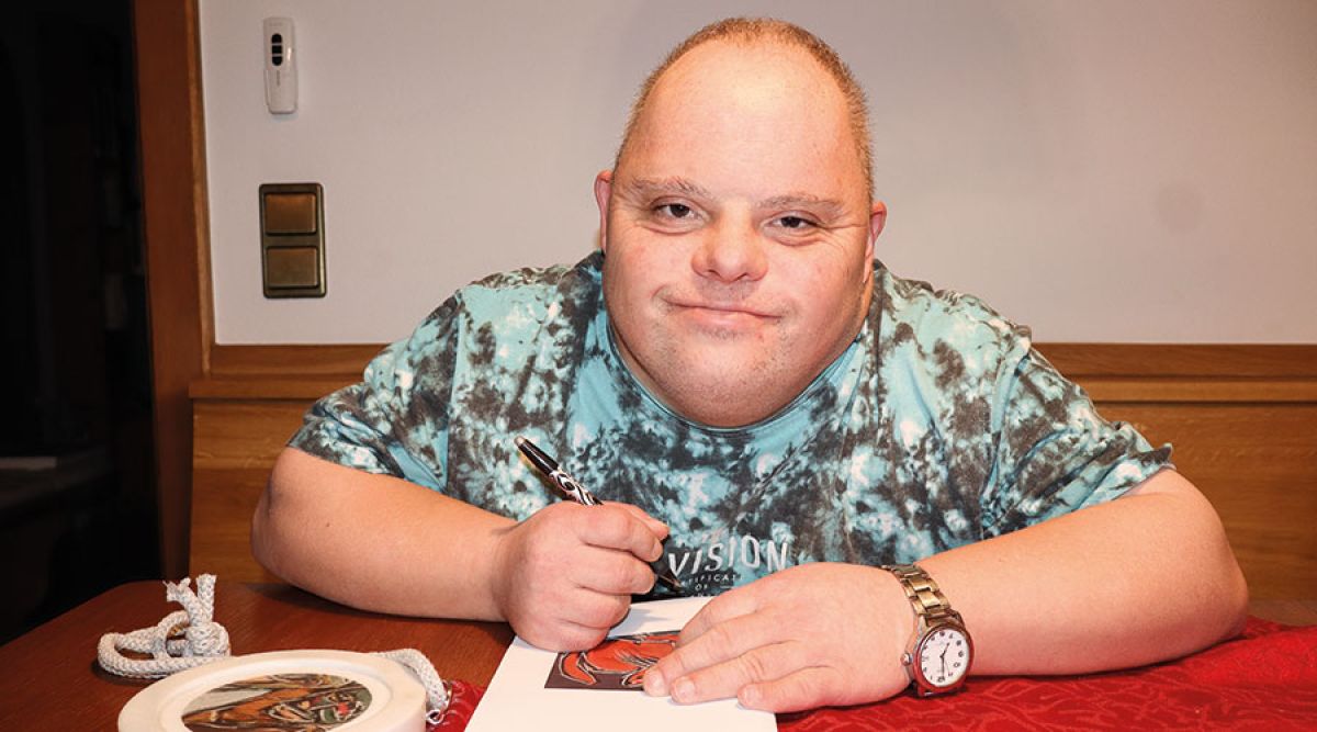 Es gib normal, obnormal und dia mit Down Syndrom. Dia mit Beeinträchtigung gibs a. Manche moanen sie sein normal, derweil fahlts groub“. So beginnt die Glosse „Normal sein olle gearn“ in der Publikation „Elmars Blick auf die Welt“. Die Texte hat Elmar Rufinatscha, genannt Elli, mit seinem Betreuer Dietmar Raffeiner in der Werkstatt mit Menschen für Behinderung in Prad im Laufe von fünf Jahren erarbeitet. Elmar wollte berühmt werden. „Wenn ma berühmt isch, norr kennt oan a jeder“, so Elmar. „Selm mecht jeder a Autogramm hobm. Wenn a viel int Zeitung drin bisch, norr bisch berühmt“. Und Elmar ist nun berühmt. Er ist der erste Preisträger des „Georg Paulmichl Preises“. Er gibt Autogramme, schaut aus den Zeitungen und sogar aus dem Fernseher heraus. Der Preis ist nach dem bekannten Prader Schriftsteller und Künstler Georg Paulmichl (1960 - 2020) benannt, der ebenfalls von Raffeiner gefördert worden ist. Elmar erhielt eine Marmor Medaille überreicht mit dem Aufdruck „Wir haben Glück gehabt, dass es dich gibt“ - eine Abwandlung des Paulmichl Zitates „Ich habe Glück gehabt, dass es mich gibt“. Elmar ist 38 Jahre alt. Er wuchs mit drei älteren Geschwistern in Taufers i. M. auf und lebt dort bei seinen Eltern. „I wohn iatz in Pradatsch“ erklärt er. Dort fand die Familie ein neues Zuhause, nachdem 2015 ein Brand ihren Hof zerstört hatte. Damals erlitt Elmar einen Schock, der bei ihm noch heute nachwirkt. Elmar besuchte die Grundschule in Taufers, die Mittelschule in Glurns und die Landesberufsschule in Schlanders. Stets erfuhr er spezielle Betreuungen. „I hon die Lehrer oft a bissl tratzt“, scherzt er. Nach der Pflichtschule fand er eine Beschäftigung als Gemeindearbeiter in Taufers i. M. „Selm hots miar gonz guat gfolln“ betont er. Doch leider machten ihm epileptische Anfälle einen Strich durch die Rechnung. Elmar kam in die Werkstatt in Prad. Dort traf er seiner Freundin Ladina und seinen Betreuer Raffeiner, der ihn unter seine Fittiche nahm. In seinem Heimatort ist Elli voll integriert. Er liebt die Musik der „Jungen Pseirer“, und er ist Fan der Tauferer Musikkapelle. Bereit von klein auf durfte er beim „Silvesterblasen“ die große Trommel ziehen. Er wurde dafür sogar mit dem „Trommelzieher Diplom“ geehrt. Elli liebt das Theater und schaut sich gerne bayrische Komödien an. Bei der Heimatbühne Taufers i. M. ist er eine feste Größe. Als „Zettelkontrolleur“ steht er am Eintritt, und zur Verneigung zieht er den Souffleur aus dem Kasten. Elmar war bereits öfters als Filmstatist im Einsatz, so bei den Dreharbeiten „Das finstere Tal“. Und er träumt davon, einmal im Trachtenkleid als Trommler auftreten zu können. Elli liebt die Geselligkeit und hie und da auch ein Bier. Am liebsten isst er Pizza, Cordon Blue und heiße Würste. „Als Londeshauptmann tat i in jedn Dorf a Würstlbude aufstellen“, meint er. Willkommene Abwechslung bietet ihm die Sonntagsbetreuung im Haus der Lebenshilfe in Schlanders. Sein größter Wunsch wäre es, in einer Wohngemeinschaft zu leben. Und er möchte weiterhin Literat sein. Elli schöpft aus Erfahrungen und Beobachtungen. Seine Texte halten den Menschen humorvoll den Spiegel vor, so auch mit dem treffenden Zitat: „Wenn die Leit bsoffn sein, norr sein sie olle nimmer normal.“ (mds)