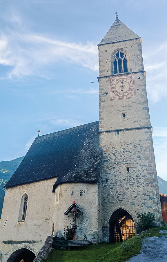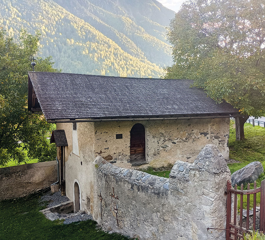 Den Ortseingang von Laatsch – und damit auch den Ausgangspunkt unserer kunsthistorischen Wanderung durch das Dorf – prägen zwei Türme: Zum einen der romanische Turm der alten Pfarrkirche, die erstmals im Jahr 1307 urkundlich erwähnt wurde, zum anderen der imposante Pfarrturm der neuen Pfarrkirche die 1910 zu Ehren des heiligen Bischofs und Märtyrers Lucius von Chur geweiht wurde. Die alte Lucius-Pfarrkirche war in ihren Anfängen offenbar recht bescheiden, denn zahlreiche Quellen aus dem 15. Jahrhundert bezeichnen sie lediglich als „capella“. Über die Jahrhunderte hinweg geriet sie mehrfach in die Kritik: So bezeichnete der Churer Bischof die Kirche 1638 im Rahmen einer Visitation als „minderwertiger als alle anderen Kirchen des Dorfes“. Schließlich entschied man sich, unter großen Anstrengungen, auch durch den damaligen Pfarrer Gottfried Grissemann, anfangs des 20. Jahrhunderts zu einem Neubau in neoromanisch-gotischen Mischformen. Die barocken Altäre und die Kanzel wurden von der alten Kirche übertragen und die die Ausmalung erfolgte in den Jahren 1936/37 durch Johann Peskoller. Als wahres architektonisches Juwel thront die Kirche St. Leonhard auf dem felsigen Berghang. Besonders markant ist die gewölbte Durchfahrt unter dem Chor- und Altarraum, durch die bislang die Straße nach Taufers führte. Künftig wird St. Leonhard im Zuge der Tempo-30-Zone umfahren. Die Durchfahrt ist dann nicht mehr erlaubt, was für die Kirche durchaus eine Aufwertung bedeuten könnte. Die im Kern romanische Leonhardskirche wurde 1408 im gotischen Stil über den Felsen hinaus erweitert und im Zuge der Calvenschlacht 1499 so sehr in Mitleidenschaft gezogen, sodass sie 1505 neu geweiht werden musste. Im Turm befindet sich ein historisch wertvolles Glockenpaar des Glockengießers Francesco Sermondo aus Bormio, gegossen 1522 und 1528, das mit seinem unverkennbaren,