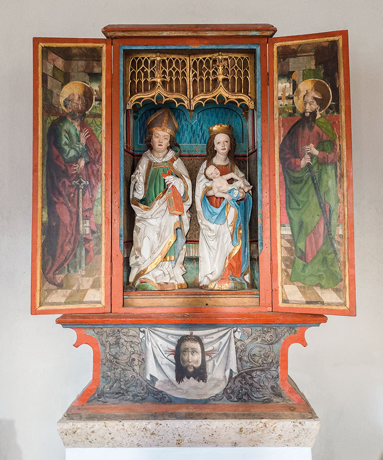 Flügelaltar, der um 1500 entstand und ein seltenes Beispiel für einen Altar mit nur zwei Figuren im Schrein darstellt. Nach einer mustergültigen Restaurierung steht er heute in der St.-Thomas-Kapelle am Friedhof von Laatsch.