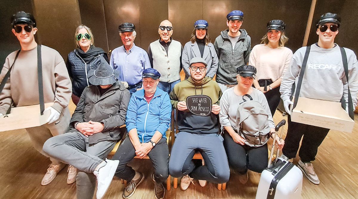 Diese illustren Fahrgäste stranden am Bahnhof in Meran und warten vergeblich auf den Anschlusszug nach Brixen: v. l. Marian Fabi, Juliane Punt, Joachim Moriggl, Erich Telser, Elmar Kuenrath, Valentin Kuenrath, Mirko Kuenrath, Karin Federspiel, Jonas Thöni, Notburga Peer, Sara Fliri, Felix Punt