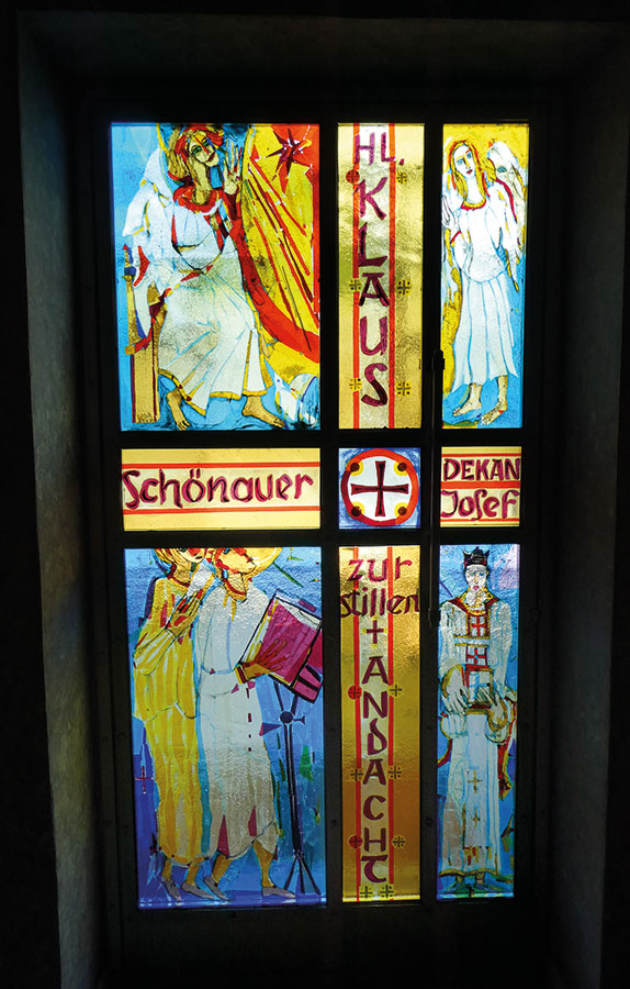 Im Sommer 2023 war Robert Scherer für etwa einem Monat vorübergehend im Bürgerheim „Nikolaus von der Flüe“ in Schlanders aufgenommen. Ich ging ihn damals einige Male besuchen. Mit einem Glas Himbeersaft haben wir miteinander angestoßen. Einmal fragte ich ihn, ob ich ihn in die Hauskapelle führen solle, die er so wunderbar ausgemalt hat. „Da müssen wir hin“, sagte er. In der Kapelle war er offensichtlich erstaunt von all dem, was er da sah, er konnte sich allerdindgs nicht mehr daran erinnern, es selbst gemacht zu haben. „Weißt du, ich habe viel gearbeitet, viel zuviel“, sagte er. Er wollte gar nicht mehr gehen, so beeindruckt war er von all dem, was er da sah. Er bat mich, ihn im Rollstuhl in jede Ecke der Hauskapelle zu schieben, um alles aus einer anderen Perspektive betrachten zu können.