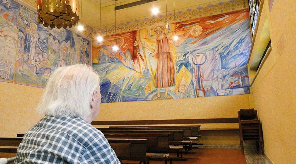 Robert Scherer im Sommer 2023 in der Hauskapelle des Bürgerheims „Nikolaus von der Flüe“ vor dem „Sonnengesang“ des Heiligen Franziskus