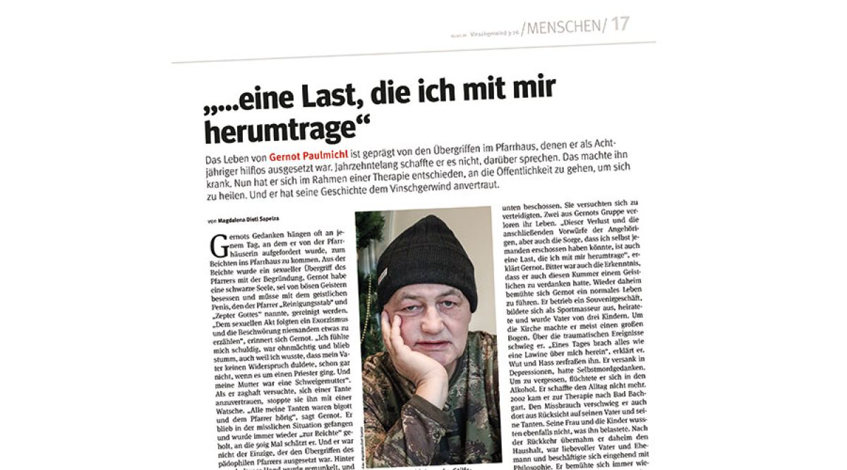 Ein erstes Interview im Katholischen Sonntagsblatt, welches Gernot Paulmichl gegeben hat und welches dem Porträt im Vinschgerwind vorausgegangen ist, hat in der breiten Öffentlichkeit kaum Staub aufgewirbelt, hat aber den Missbrauchsfall in kirchlichen Kreisen mit Sicherheit dermaßen nachhaltig bekannt gemacht, so dass er innerkirchlich nicht ignoriert werden kann.