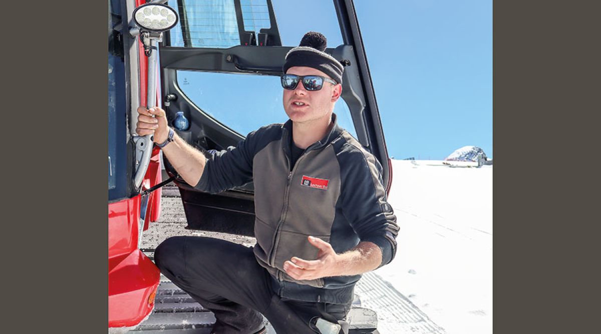 Am 28. Mai 2024 setzte sich Elias zum ersten Mal in die Pistenraupe auf 3.000 m und begann damit einen großen Schneehaufen zu verschieben. Alles war neu für ihn. Er musste lernen mit dem Schild vorne an der Pistenraupe zu arbeiten und die Länge und Breite des Gefährts richtig einzuschätzen. In den ersten zwei Wochen war er einige Male nahe dran, das Handtuch zu werfen. Er rang mit sich selbst, wollte sich aber nicht so schnell eine Blöße geben. „Deis muaß geahn, wenns ondre derrichtn, dericht is a“, sagte er sich. Und er schaffte es.