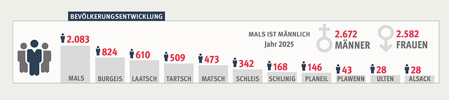 Wohl keine Gemeinde hat so viele Fraktionen wie Mals. Eine jede hat ihre Eigenheit. Matsch ist das erste Bergsteigerdorf Südtirols. Laatsch ist eine Perle, kulturell - und auch wegen der „Lootscher“ selbst. Burgeis steht für sich und ist ein Kleinod, das seinesgleichen sucht. Tartsch mit dem Tartscher Bühel ist genauso wie Planeil etwas ganz Besonderes. Schlinig ist das kleine Paradies der Gemeinde Mals. Schleis hat einen unverwechselbaren Charakter und Plawenn, Ulten, Alsack sind Seelendörfer - hier kennt jeder jeden.