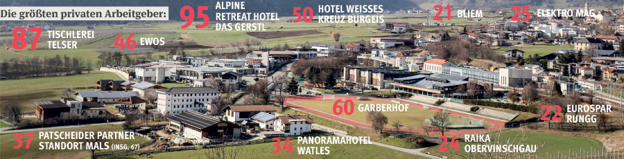 Die größten Arbeitgeber. DAS GERSTL Alpine Retreat zählt eindeutig zu den Top-Arbeitgebern in der Gemeinde Mals. „Im DAS GERSTL Alpine Retreat sind aktuell 95 Mitarbeiter angestellt. Wobei zwölf Mitarbeiter in bzw. für beide DAS GERSTL Betriebe tätig sind“, heißt es aus der Marketing-Abteilung. Denn die Familie Gerstl hat im vergangenen Jahr DAS GERSTL Family Retreat am Reschensee eröffnet, ein Fünf-Sterne-Haus, das sogar eine Kita beherbergt. DAS GERSTL ist zweifelsohne ein Vorzeigebetrieb.