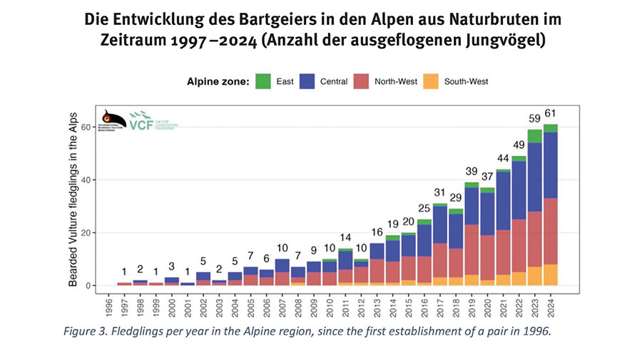 • Zur Reproduktion im Freiland gibt es für den Alpenbogen folgende Statistik: 98 besetzte Territorien, 85 Gelege, 61 Jungvögel, die flügge geworden sind.