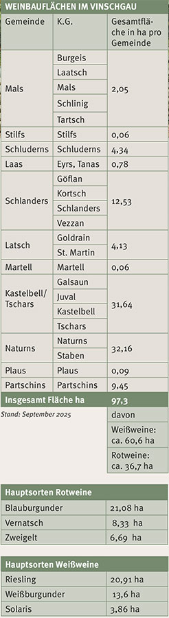 Im Gegensatz zu anderen Regionen ist der Vinschger Weinbau nicht von großen Genossenschaften, sondern von kleinen Kellereien geprägt. Im Vinschgau keltern viele Familienbetriebe ihre Weine selbst, mit beachtlichem Erfolg. Die Gemeinden Naturns, Plaus, Partschins. Kastelbell/Tschars, Latsch und Schlanders sind als DOC-Gebiete anerkannt. Ihre Weinbaufläche liegt bei rund 97 Hektar. DOC steht für „Denominazione di Origine Controllata“- das heißt: kontrollierte Ursprungsbezeichnung.