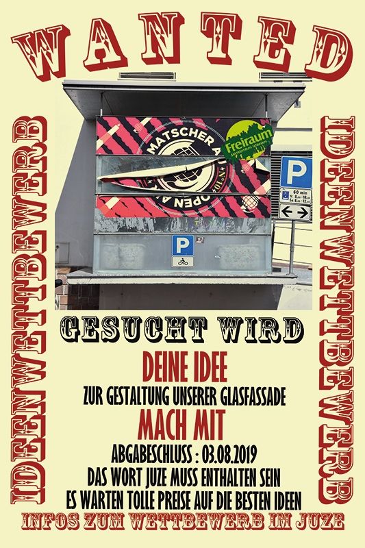 Du bist zwischen 11 und 25 Jahren und hast eine Idee wie unsere Glasfassade in Zukunft aussehen könnte? Dann nimm doch an unserem Ideenwettbewerb teil und vielleicht veröffentlichen wir deine Idee an unserem Jugendzentrum. Das Wort JuZe sollte enthalten sein. Die besten Ideen werden mit tollen Preisen prämiert. Abgabeschluss ist der 03.08.19. Genauere Informationen zum Wettbewerb bekommst du im Jugendzentrum Freiraum in Schlanders.