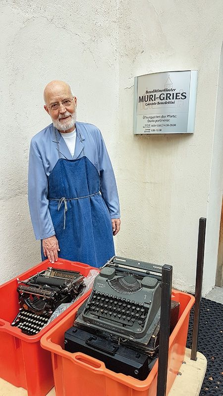 Bereits zum 3. Mal in den letzten Jahren hat Pater Plazidus Hungerbühler vom Kloster Muri Gries in Bozen das Schreibmaschinenmuseum in Partschins kontaktiert, um dem Museum einige historische Schreibmaschinen aus dem Bestand des Klosters zu übergeben. Museumsleiterin Maria Mayr holte persönlich einige Modelle – darunter eine „Hermes“ aus der Schweiz - in Bozen ab, bedankte sich für die Schenkung mit einer Einladung zu einer Museumsführung. Foto: Pater Plazidus mit den Schreibmaschinen, fotograf…