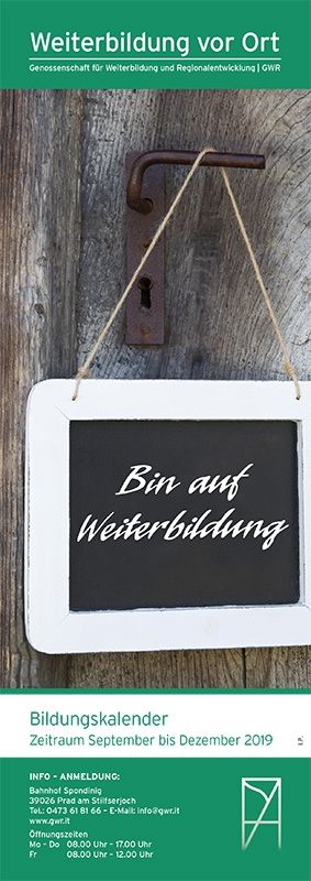 pr-info GWR Spondinig - Der neue Bildungskalender für den Zeitraum September bis Dezember 2019 der Genossenschaft für Weiterbildung und Regionalentwicklung (GWR) ist dieser Ausgabe beigefügt. Die Kurse und Seminare werden an verschiedenen Orten im gesamten Vinschgau abgehalten. Neben den Angeboten in den Bereichen Gesundheit, Freizeit, Sprachen, Arbeitssicherheit und EDV ist auch das Kursprogramm der IVHS (Integrierte Volkshochschule Vinschgau) für Menschen mit und ohne Behinderung im Kalender…