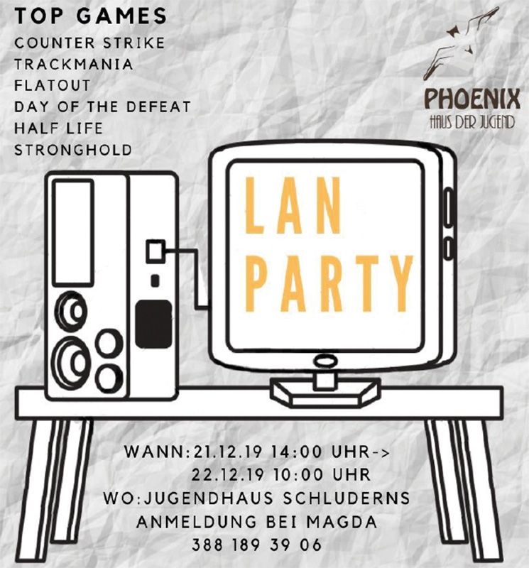 Das Jugendhaus Phönix Schluderns veranstaltet eine Lan-Party. Start am Samstag 21.12.19, dann wird gezockt die ganze Nacht bis 22.12.19. Hast du bock? Dann melde dich bei Magda! Es erwarten euch tolle Spiele. Tel. 388 189 39 06