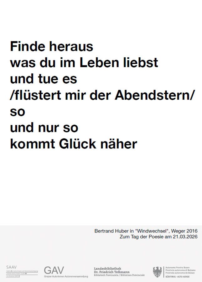 Am Internationalen Tag der Poesie am 21. März wird auch in Südtirol die Lyrik sichtbar: Rund zwei Wochen lang sind Gedichte von 19 Südtiroler Autorinnen und Autoren an den Bozner Litfaßsäulen sowie auf Werbeflächen in verschiedenen Ortschaften Südtirols zu lesen. Neu in diesem Jahr ist die Beteiligung der Landesbibliothek Teßmann.