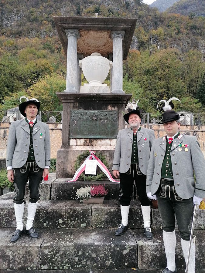 Marcello Delucca, Heimatbunddelegierter für Welschtirol, erklärte, dieses Projekt entsteht aus der wichtigen Zusammenarbeit zwischen dem SHB und dem Schützenbund Welschtirol. Die Gedenktafel, die wir am Kranz anbringen, ist eine von 25 Gedenktafeln. Wir werden sie an den Denkmälern für die Tiroler Gefallenen italienischer Muttersprache des Krieges 1914–1918 anbringen. Erinnerung und historische Wahrheit müssen ans Licht gebracht werden, auch für die jüngeren Generationen. Viele Kriegerdenkmäler tragen faschistische Inschriften, die versuchten, unsere Geschichte auszulöschen. In einigen Fällen sind die Namen von Die Gefallenen sind nicht mehr lesbar, während die Schriften aus der Zeit des Faschismus erneuert wurden. Wir setzen uns für ihre Pflege und Wiederherstellung ein, in Zusammenarbeit mit den Stadtverwaltungen, im Geiste des Friedens und der Wahrheit, so Delucca.