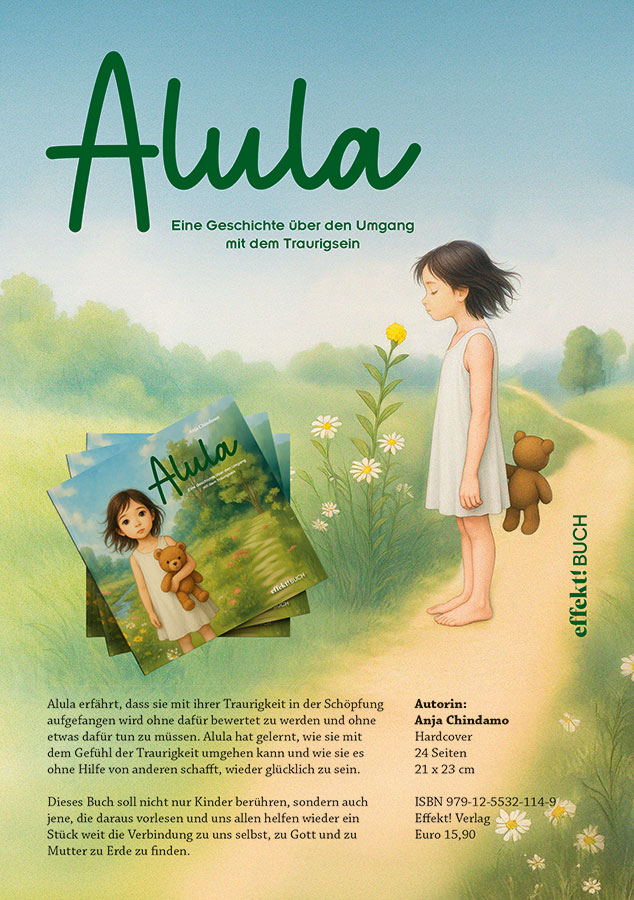 Dieses einfühlsame Kinderbuch widmet sich einem Thema, das Kinder wie Erwachsene gleichermaßen betrifft: dem Traurigsein. In einfachen, klaren Worten erzählt die Autorin Anja Chindamo die Geschichte von Alula, einem Kind, das spürt, wie sich Traurigkeit wie ein schwerer Stein im Herzen anfühlen kann.Doch Alula entdeckt, dass Gefühle ihren Platz haben dürfen – und dass es Wege gibt, mit ihnen umzugehen. Mit Teddy an der Seite macht sie sich auf in die Natur, wo Blumen, Tiere, Sonne, Regen und Wind ihr helfen, den Stein loszulassen, bis er sich in eine Feder verwandelt.