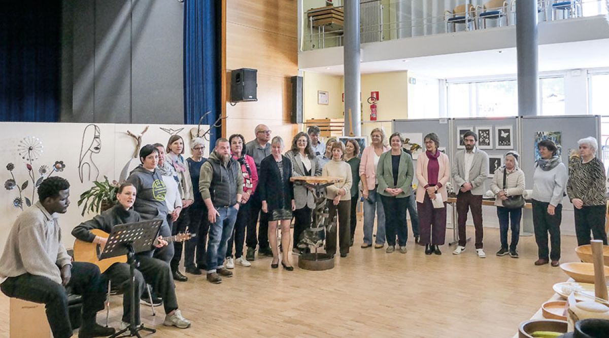 Gudrun Warger, die Präsidentin vom Bildungsausschuss Schlanders, konnte Werke von Freizeitkünstlern und einige Arbeiten vom Treffpunkt Schlanders im Sparkassensaal des Kulturhauses präsentieren. Ausgestellt wurden Zeichnungen, Malereien, Klöppelarbeiten und weitere Handwerksarbeiten aus Holz, Metall, Stein und Ton. Einige Werke entstanden aus Abfallprodukten, die künstlerisch umgestaltet wurden. Die BM Christine Kaaserer, die Kulturreferentin Kunhilde von Marsoner und der Kulturhauspräsident Daniel Clemente dankten dem Bildungsausschuss und den Künstlern für diese wertvolle Initiative. Sie betonten den Mut der Künstler:innen mit ihren Arbeiten auch an die Öffentlichkeit zu gehen, lobten die Leidenschaft und die Vielfalt, die durch diese Arbeiten zum Ausdruck kommen. Musikalisch umrahmt wurde die Ausstellungseröffnung am 28. Februar von Barbara Steck und Arthur Katura auf der Gitarre und dem Cajon.