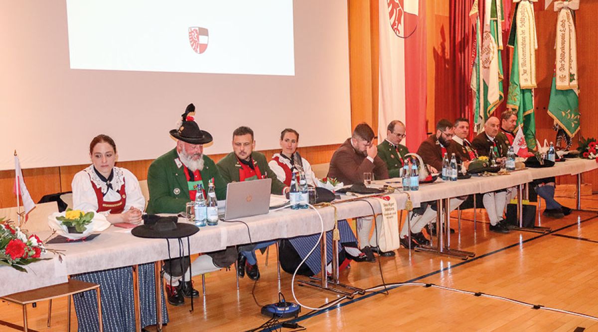 Die anschließende Tagung im Mehrzwecksaal unter dem Motto: „Gemeinsam sind wir stark“, geleitet von Bezirksmajor Hansjörg Eberhöfer, stand im Zeichen von Rückblick auf die unterschiedlichen Tätigkeiten im vergangenen Jahr, darunter die Teilnahme am Tiroler Ball in Wien als Höhepunkt, und auch der Vorschau. Und sie stand im Zeichen der ehrenden Erinnerung an die verstorbenen Freiheitskämpfer Sepp Forer, und Siegfried Steger, die zusammen mit anderen für die Freiheit Südtirols gekämpft hatten. Steger ist erst kürzlich im Sarg aus dem Exil in Österreich in die Heimat zurückgekehrt. „Dass niemand von der Landesregierung bei Stegers Begräbnis dabei war, ist zum Schämen“, ärgerte sich Bataillonskommandant Peter Raffeiner. Den Schützen stoßt auch sauer auf, dass die Südtiroler Landespolitiker der SVP bei der jüngsten Regierungsbildung eine Koalition mit Vertretern italienischen Rechtspartei eingegangen sind, jenen Parteien, die Südtirol einst italianisieren beziehungsweise im Zuge der Option entvölkern wollten. Und Unverständnis herrscht darüber, dass es eine Polemik um den Namen Tirol anlässlich der olympischen Spiele gegeben hatte in Unkenntnis der Geschichte des Landes. Die Schützen seien heute mehr denn je gefordert, für die Werte, Heimat, Freiheit, Tradition und Kameradschaft einzustehen, die Tiroler Identität zu bewahren, die Erinnerung als Mahnung aufrecht zu erhalten und Stärke zu zeigen“ erklärte Eberhöfer und betonte. „Wir sind das Gewissen des Landes“. In den 19 Schützen Kompanien im Bezirk Vinschgau sind 640 aktive Schützen organisiert, die bei 80 Anlässen ausgerückt sind. Auszeichnungen gab es für Trommler und für die Schützen in Kortsch, die als Kompanie des Jahres ausgezeichnet wurden. Zu den Ehrengästen zählten BMin Roselinde Gunsch, Vertreter der Bundesleitung und der Nachbarbezirke. Große Wertschätzung wurde den Marketenderinnen entgegengebracht.