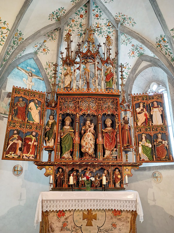 Flügelaltar, der um 1500 entstand und ein seltenes Beispiel für einen Altar mit nur zwei Figuren im Schrein darstellt. Nach einer mustergültigen Restaurierung steht er heute in der St.-Thomas-Kapelle am Friedhof von Laatsch.