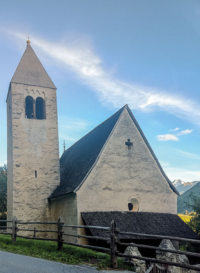 Den Ortseingang von Laatsch – und damit auch den Ausgangspunkt unserer kunsthistorischen Wanderung durch das Dorf – prägen zwei Türme: Zum einen der romanische Turm der alten Pfarrkirche, die erstmals im Jahr 1307 urkundlich erwähnt wurde, zum anderen der imposante Pfarrturm der neuen Pfarrkirche die 1910 zu Ehren des heiligen Bischofs und Märtyrers Lucius von Chur geweiht wurde. Die alte Lucius-Pfarrkirche war in ihren Anfängen offenbar recht bescheiden, denn zahlreiche Quellen aus dem 15. Jahrhundert bezeichnen sie lediglich als „capella“. Über die Jahrhunderte hinweg geriet sie mehrfach in die Kritik: So bezeichnete der Churer Bischof die Kirche 1638 im Rahmen einer Visitation als „minderwertiger als alle anderen Kirchen des Dorfes“. Schließlich entschied man sich, unter großen Anstrengungen, auch durch den damaligen Pfarrer Gottfried Grissemann, anfangs des 20. Jahrhunderts zu einem Neubau in neoromanisch-gotischen Mischformen. Die barocken Altäre und die Kanzel wurden von der alten Kirche übertragen und die die Ausmalung erfolgte in den Jahren 1936/37 durch Johann Peskoller. Als wahres architektonisches Juwel thront die Kirche St. Leonhard auf dem felsigen Berghang. Besonders markant ist die gewölbte Durchfahrt unter dem Chor- und Altarraum, durch die bislang die Straße nach Taufers führte. Künftig wird St. Leonhard im Zuge der Tempo-30-Zone umfahren. Die Durchfahrt ist dann nicht mehr erlaubt, was für die Kirche durchaus eine Aufwertung bedeuten könnte. Die im Kern romanische Leonhardskirche wurde 1408 im gotischen Stil über den Felsen hinaus erweitert und im Zuge der Calvenschlacht 1499 so sehr in Mitleidenschaft gezogen, sodass sie 1505 neu geweiht werden musste. Im Turm befindet sich ein historisch wertvolles Glockenpaar des Glockengießers Francesco Sermondo aus Bormio, gegossen 1522 und 1528, das mit seinem unverkennbaren,
