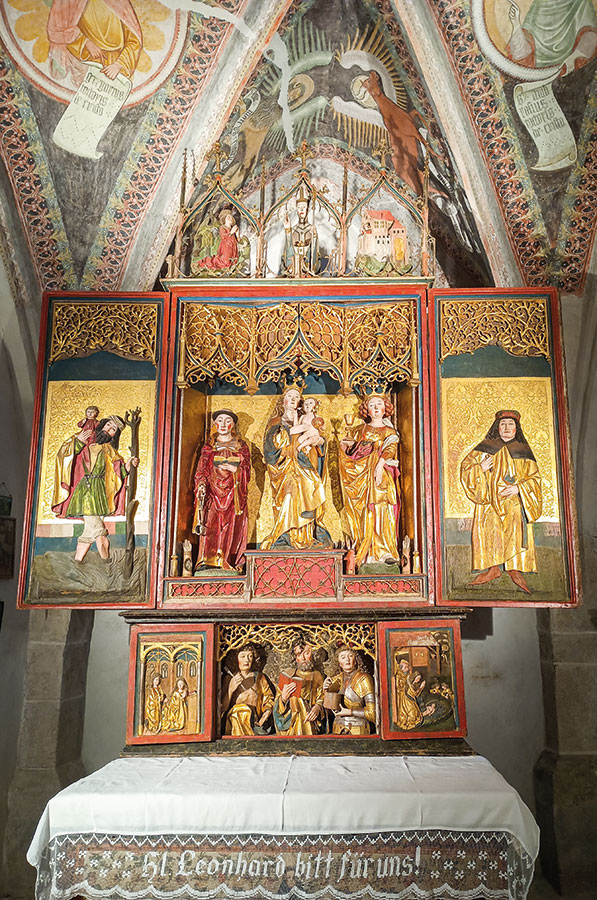 eigentümlichen Klang beeindruckt. Bei Unwettergefahr wurden in früheren Zeiten stets die Glocken von St. Leonhard geläutet, um das Unheil abzuwehren. Der Flügelaltar, der der Werkstatt von Hans Schnatterpeck zugeschrieben wird, gehört zu den wertvollsten Arbeiten dieser Kunstgattung in Südtirol. Erwähnens- und sehenswert ist auch die malerische Ausstattung der Kirche: die spätgotischen Fresken am Chorgewölbe sowie die außergewöhnlichen Fresken an der Westfassade im Innenraum, die Szenen aus dem Leben des Heiligen Leonhard von Limoges zeigen. Zudem beherbergt St. Leonhard eine seltene spätromanische Plastik der „Maria lactans“.