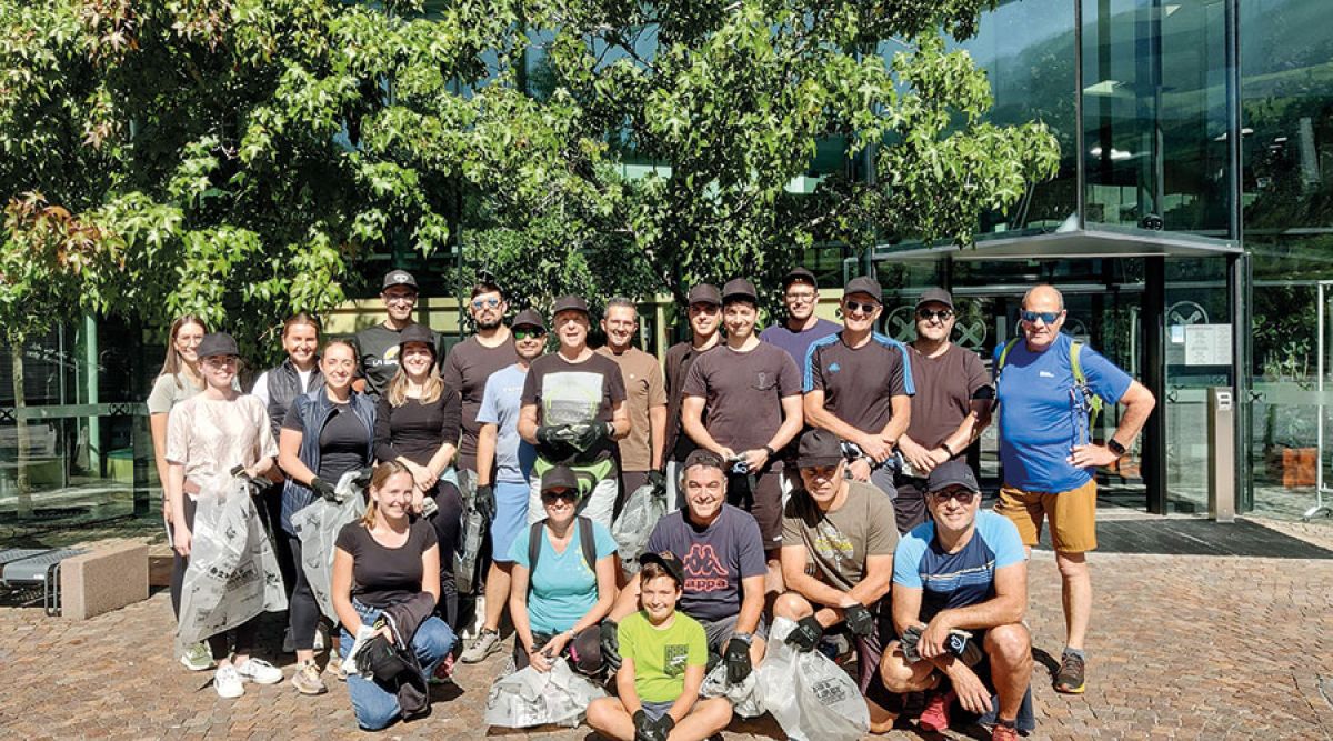 Das Mitarbeiterteam der Raiffeisenkasse Prad-Taufers sammelt Müll auf Rad- und Wanderwege in Prad und Umgebung und engagiert sich in nachhaltiger Mobilität