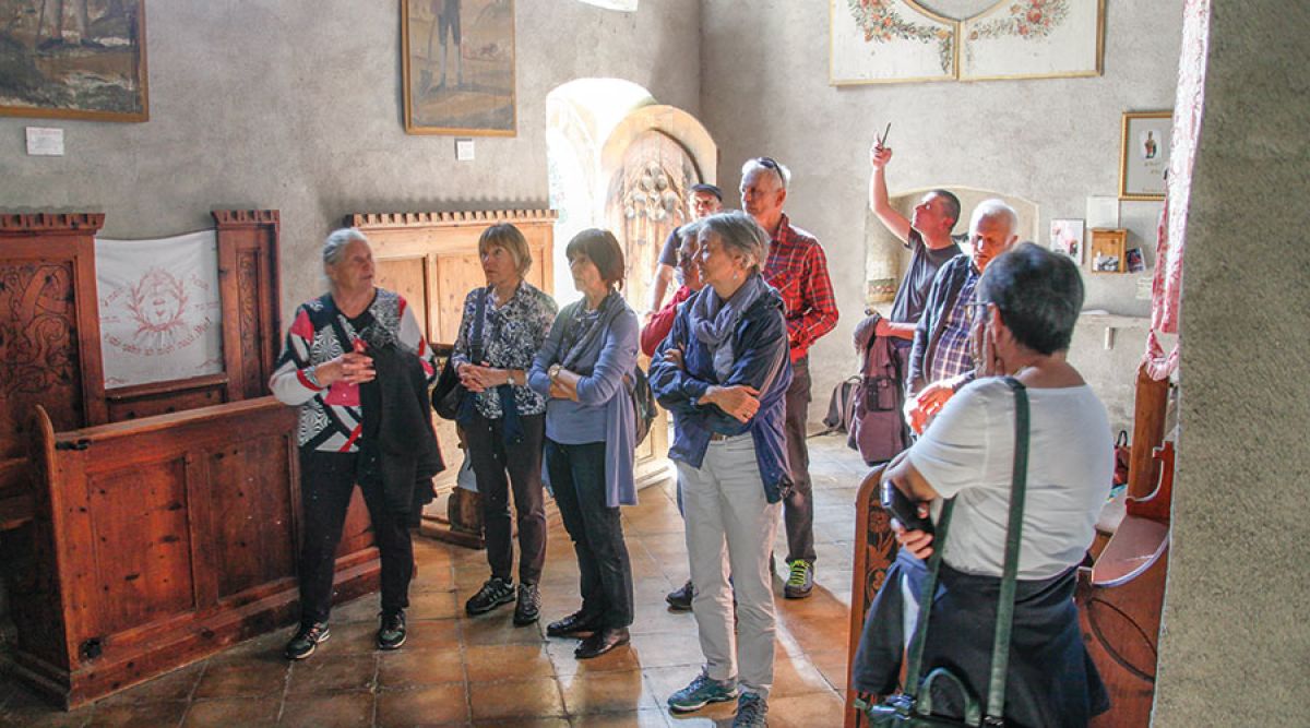 Nach Jerusalem entführte die Kunstvermittlerin Martina Plörer die Staunenden inmitten von Obstbäumen. Denn die Kirche St. Vigilius in Morter, ein Machtstatement des Trientner Fürstbischofs inmitten des Territoriums des Churer Bischofs, wurde architektonisch der Jerusalemer Grabeskirche nachempfunden und ist mit ihren drei Konchen („Muscheln“) einmalig weit über den Vinschgau hinaus. Dass die Gegend bzw. der Name Morter im 9. Jahrhundert als erste Örtlichkeit im Vinschgau schriftlich Erwähnung fand und dass die Kirche um 1080 geweiht worden ist, dass die Fresken heruntergeschlagen worden sind und dass die Kirche im Volk als Blasiuskirche bekannt ist, all das und vieles mehr erzählte Plörer einer größeren Schar Interessierter.