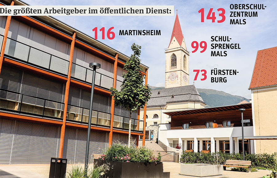 Der öffentliche Sektor. Ähnlich wie in Schlanders ist der Anteil des öffentlichen Sektors in Mals hoch. Das hat natürlich mit dem Schulstandort Mals zu tun. Zu diesem gehören neben dem Schulsprengel Mals, das Oberschulzentrum, kurz OSZ Mals und die Fachschule für Land- und Forstwirtschaft in Burgeis samt angeschlossenem Heim.