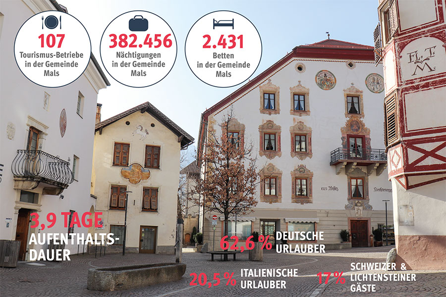 Die touristische Jahresstatistik der Gemeinde Mals ist eine beeindruckende: 108 Betriebe gibt es in der Gemeinde Mals im Bereich der Gastronomie und Hotelerie, die zusammen die stolze Anzahl von 2.431 Betten bieten. Auch die Zahlen der Ankünfte und Nächtigungen können sich mehr als sehen lassen und mit touristischen Hochburgen mithalten: 382.456 Nächtigungen und 97.472 Ankünfte verzeichnete man im Jahr 2025. Die Aufenthaltsdauer lag bei 3,9 Tagen. Die Hotellerie in der Gemeinde Mals ist erstklassig und exzellent. Ob am Watles, im Hauptort oder in den Fraktionen wie etwa Burgeis, Laatsch oder Schlinig - überall sind hervorragende Hotels und Gastronomiebetriebe zu finden, die die Gastfreundschaft mit neuen Inhalten und Werten füllen.